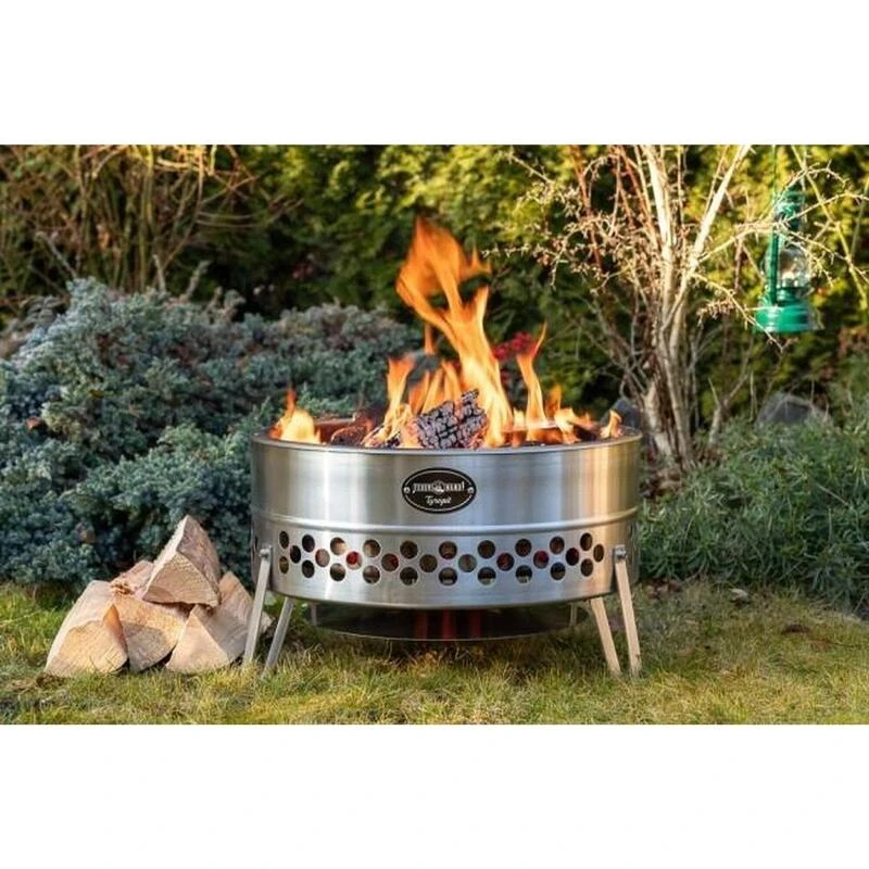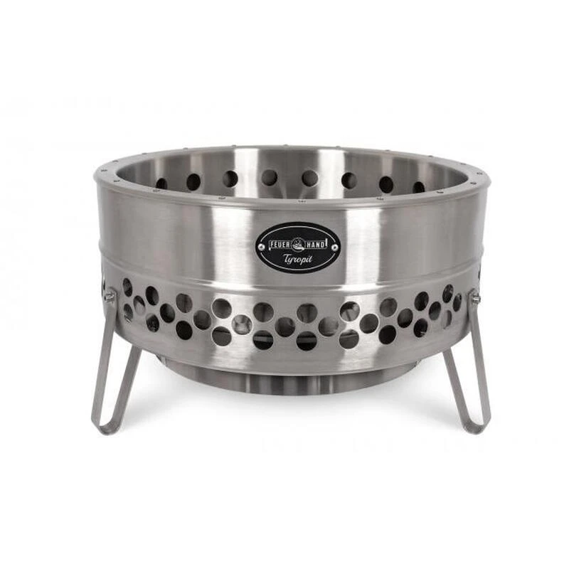 Magnifique bol de feu Feuerhand en acier inoxydable. Sa double paroi assure une chaleur minimale au fond et une combustion optimale du gaz de bois. Peu de fumée et très efficace !