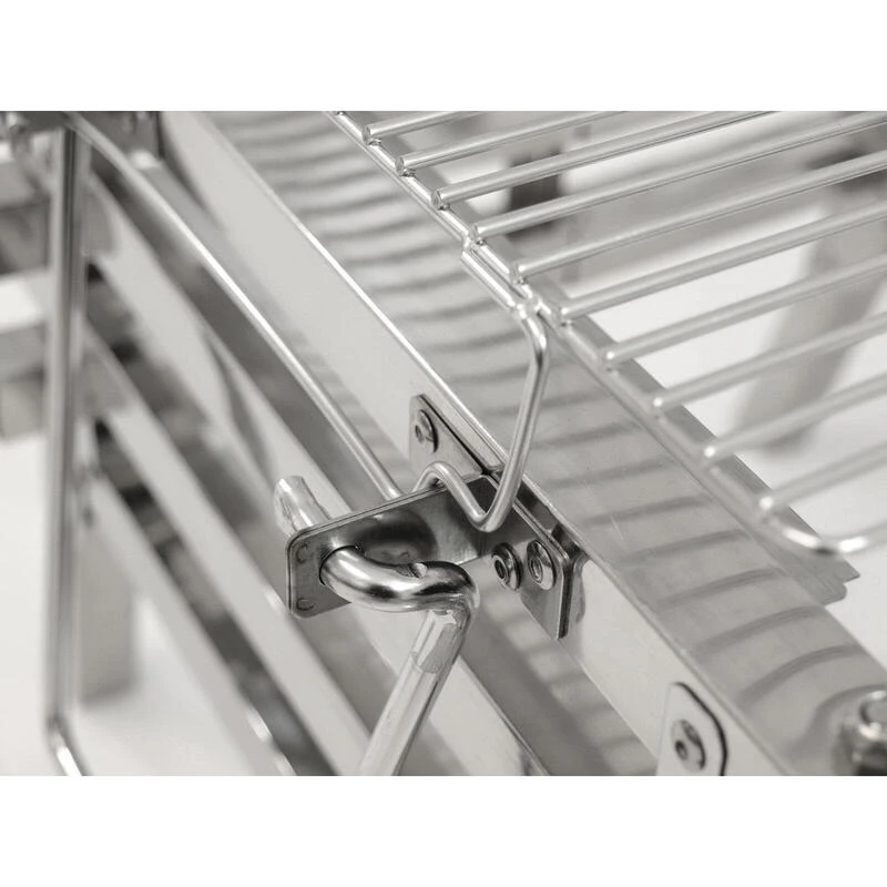 Gril pliable robuste en acier inoxydable avec hauteur de charbon réglable. Utilisable à la fois comme gril et foyer. Facile à assembler, sac de transport pratique. Plaisir de griller maximum !
