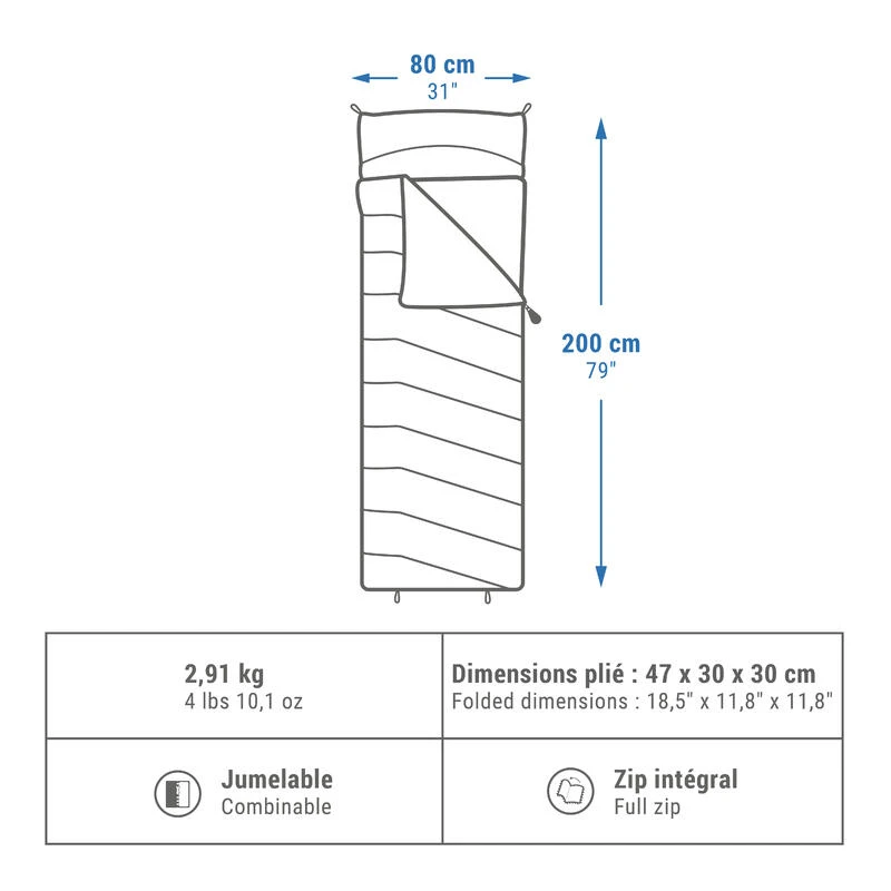 Nous vous conseillons d’utiliser une machine à laver avec une contenance 8 kg minimum et de bien fermer les fermetures éclairs de votre sac de couchage
